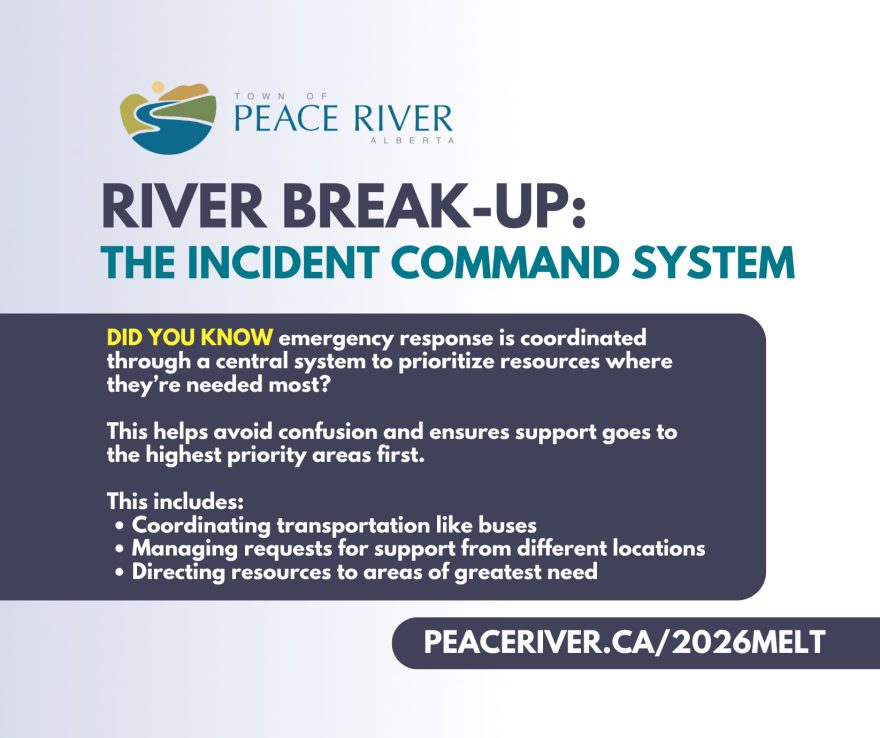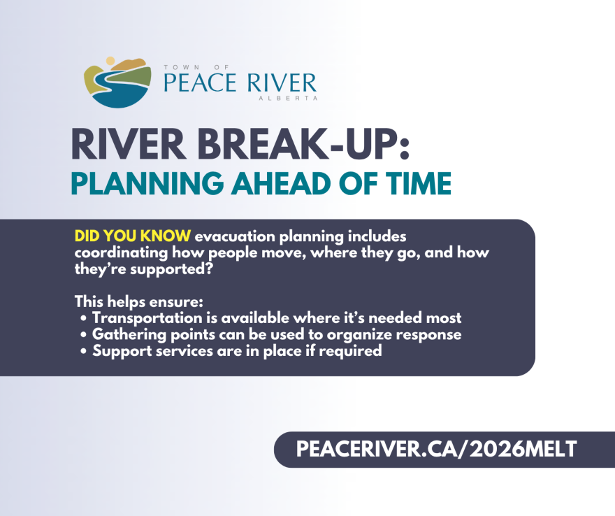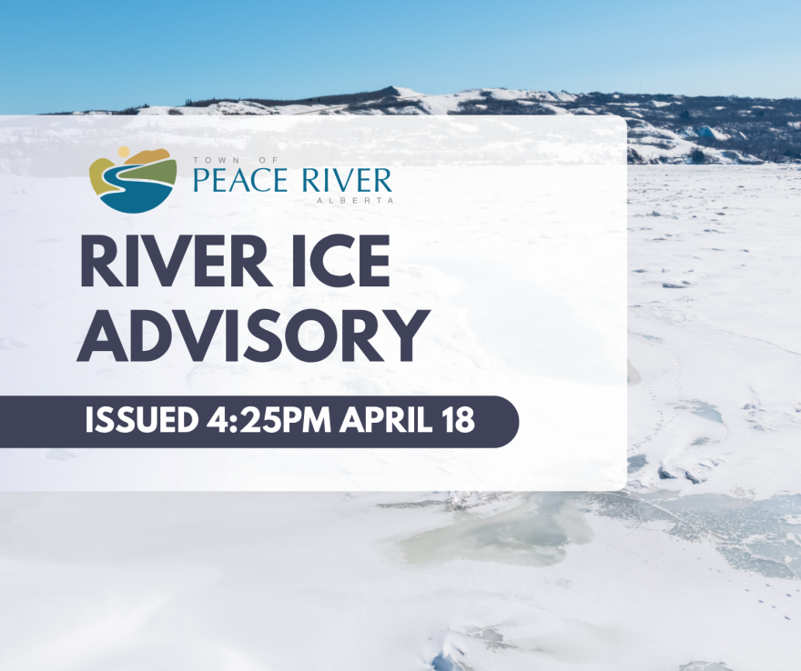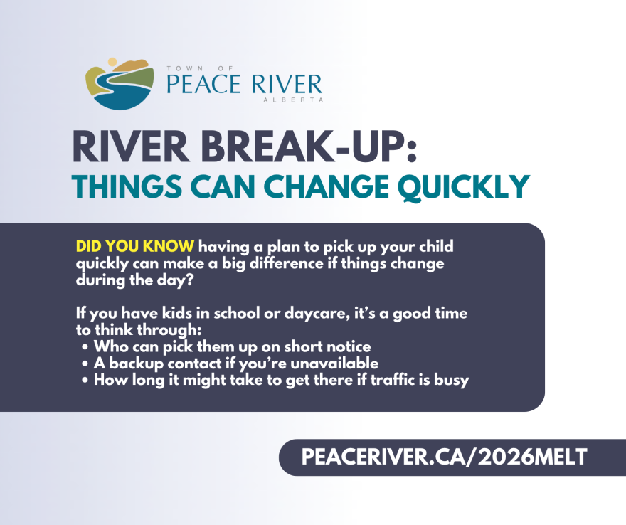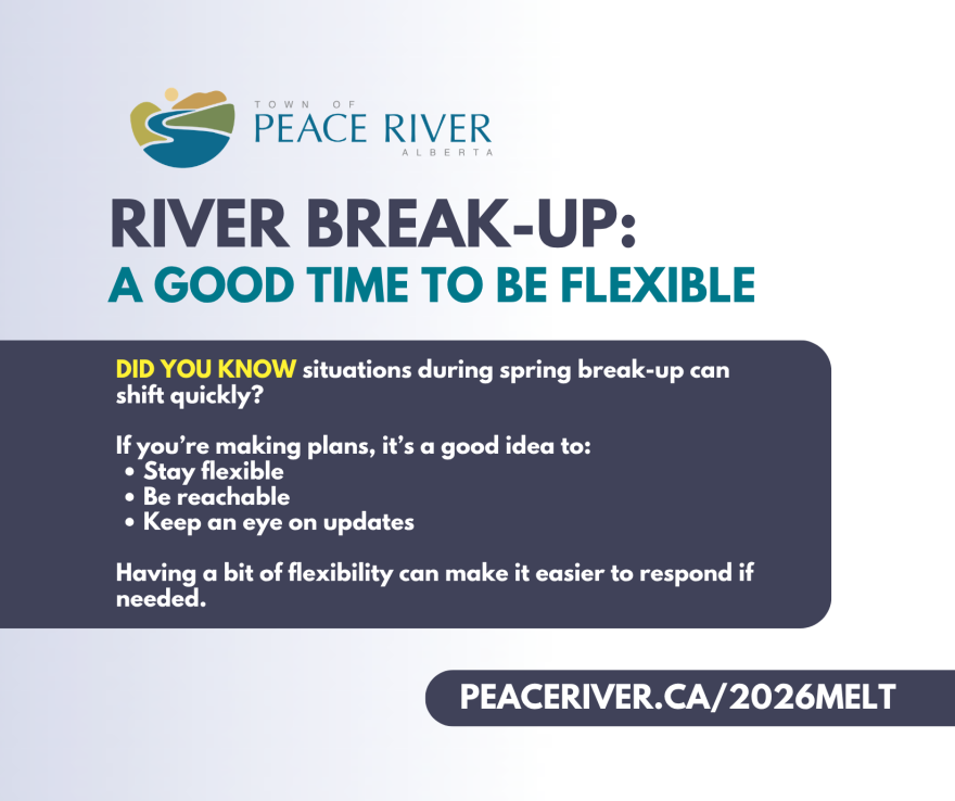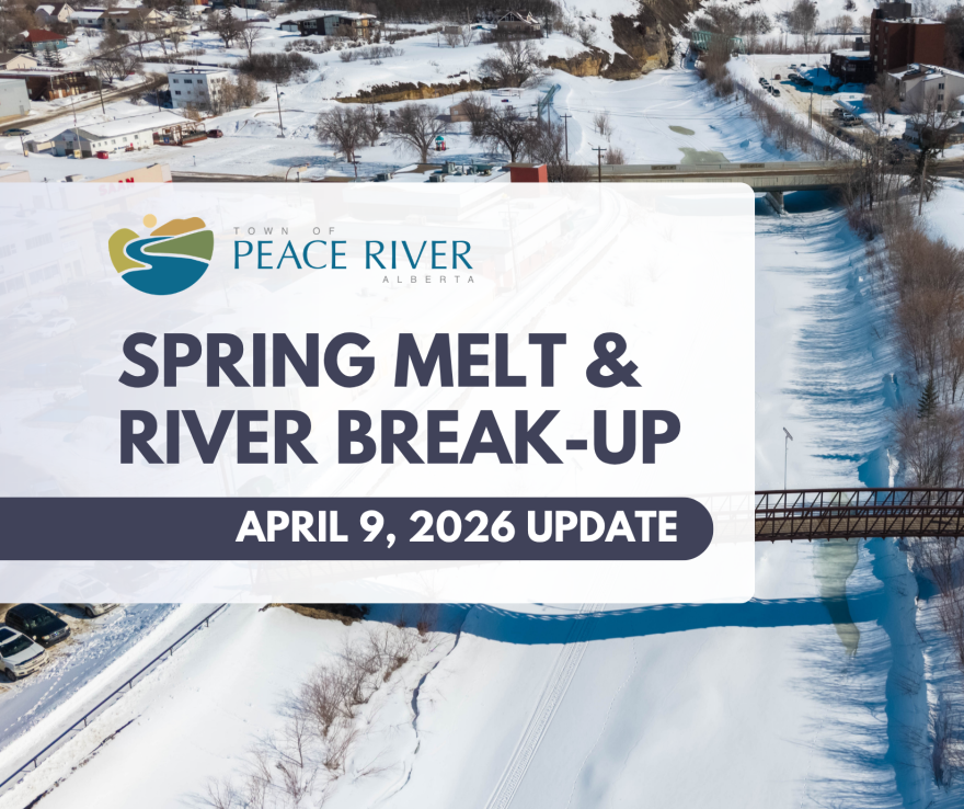 Follow the Town’s social media and website for up-to-date information. We will house all communication about the river break-up and 2026 spring melt at this link: www.peaceriver.ca/2026melt