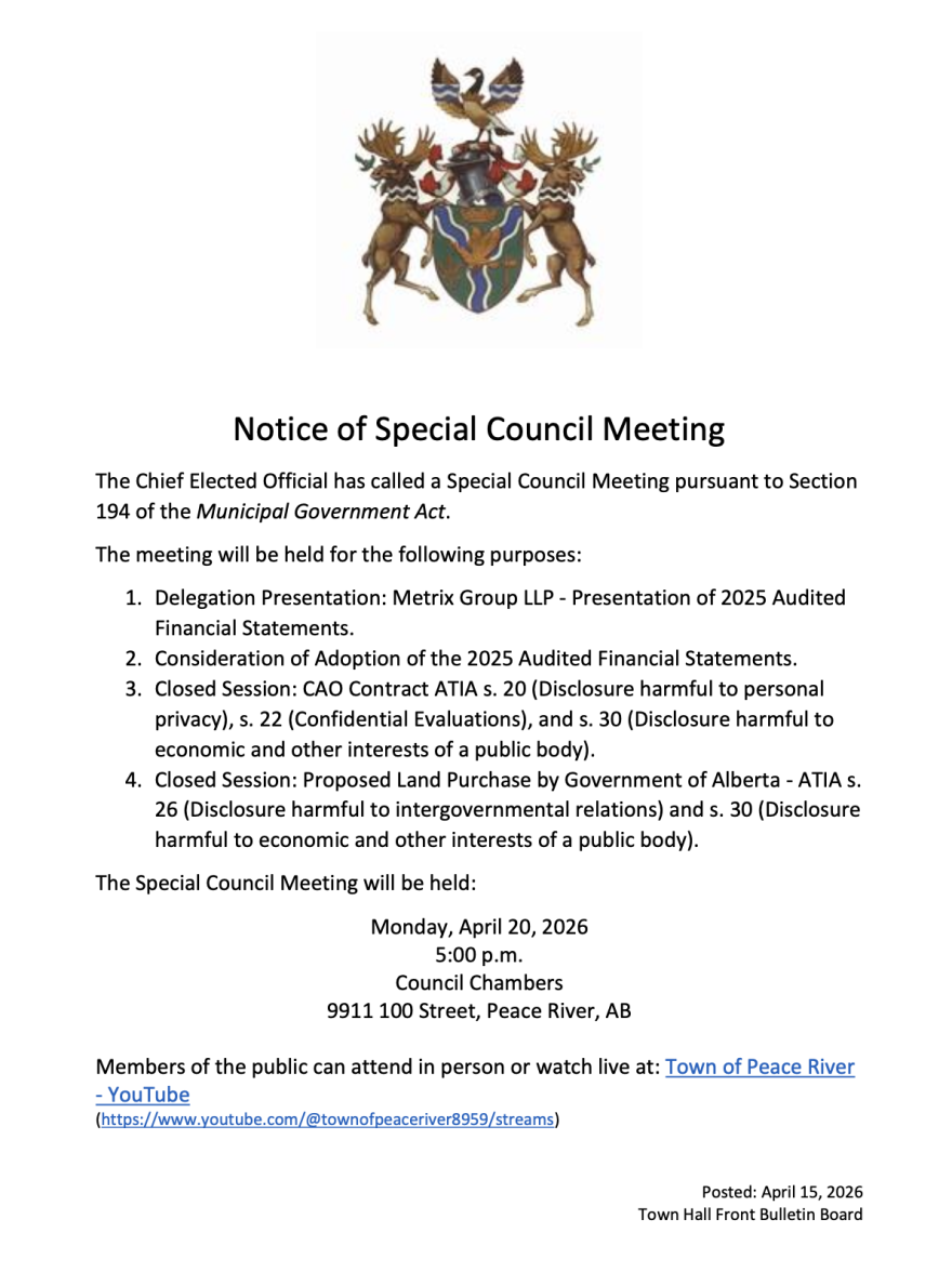 The Special Council Meeting will be held Monday, April 20, 2026, at 5:00 p.m. in the Council Chambers, 9911 100 Street, Peace River, AB.