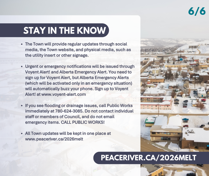 Follow the Town’s social media and website for up-to-date information. We will house all communication about the river break-up and 2026 spring melt at this link: www.peaceriver.ca/2026melt