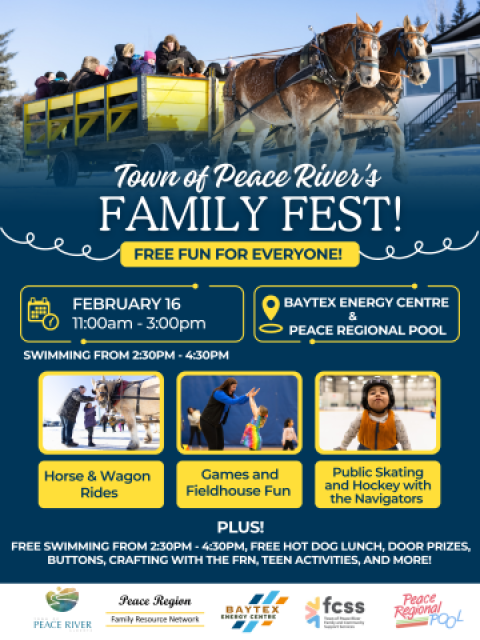 Join us for a fun, free, and family friendly day at the Baytex Energy Centre from 11:00am - 3:00pm and Peace Regional Pool from 2:30pm - 4:30pm.